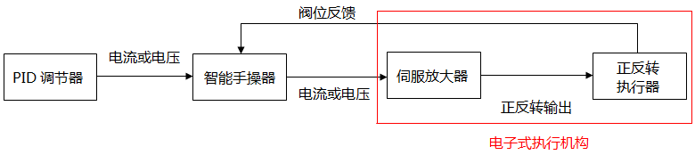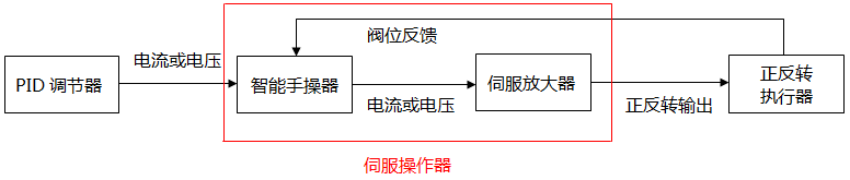 來自電動執行器外部的控制信號(控制信號為PID調節器或手操器的電流輸出)接入伺服放大器,再由伺服放大器將控制信號轉換為正轉/反轉開關量輸出控制正反轉執行器電機后輸出位移推力(直行程)或轉角力矩(角行程),驅動閥門動作。不難看出,伺服放大器是介于控制信號和執行器電機之間的中間裝置,伺服放大器可獨立存在,也可以和執行機構集成在一起或將手操器與伺服放大器集成在一起。