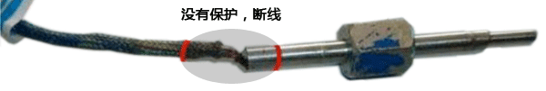 在導(dǎo)線與測溫電阻的結(jié)合部位選擇波紋管和鎧裝絲延伸保護(hù),如圖5所示。這里特別要強(qiáng)調(diào)鎧裝絲延伸保護(hù)方式,將傳感器內(nèi)部的鎧裝絲一直延伸出來,這樣導(dǎo)線受到油流沖擊的部分全部是鎧裝絲,實(shí)際上鎧裝絲是可以任意彎折的不銹鋼導(dǎo)線防護(hù)層,抗腐蝕、沖擊和振動的性能非常好,這樣可徹底解決導(dǎo)線受油腐蝕和沖擊的問題。使用壽命更久,性能更可靠。
