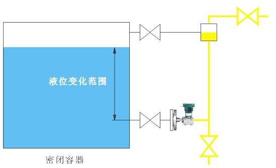 2、測量密閉容器液位,單法蘭液位變送器安裝點低于最低液位且測量變化的時,單法蘭液位變送器應該進行正遷移。