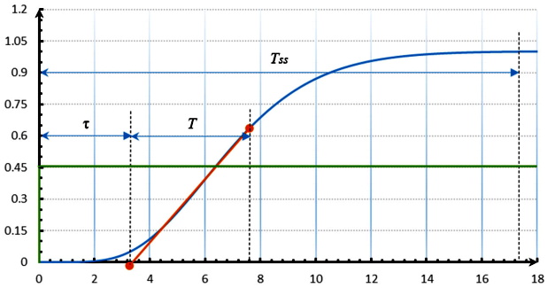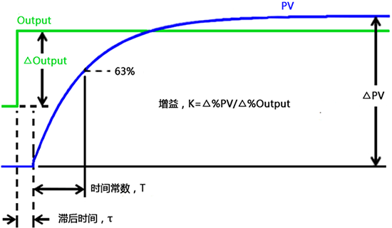 從開環響應的63.2%ΔPV,沿響應曲線向前做響應曲線的切線,切線與時間坐標軸相交。輸出變化到交點為純滯后時間τ,交點到63.2%ΔPV的時間為時間常數T。