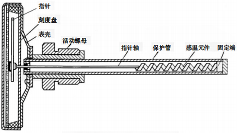 雙金屬溫度計是將繞制成螺旋形的熱雙金屬片作為感溫器件,并把它裝在保護管內,其中一端固定成為固定端,另一端連接在一根細軸上成為自由端,在自由端線軸上連接指針,如下圖所示。當溫度發生變化時,雙金屬元件的自由端隨之發生轉動,帶動細軸上的指針產生旋轉,在表盤上指示對應的溫度。