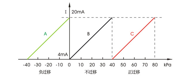 變送器的測量范圍等于量程和遷移量之和,即測量范圍=量程范圍+遷移量。如圖所示,圖中A量程為40kPa,遷移量為-40kPa,測量范圍為-40~0kPa;B量程為40kPa,無遷移量,測量范圍為0-40kPa;C量程為40kPa,遷移量為40kPa,測量范圍為40-80kPa。