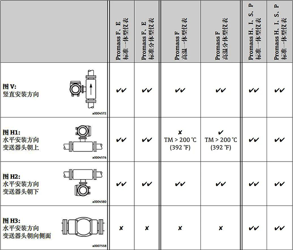 Promass F、E、H、S和P帶彎測量管的傳感器水平安裝時,傳感器的安裝位置必須與流體特性相匹配。