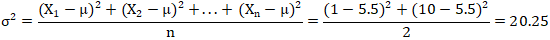 我們還是用上面的1和10兩個數(shù)字,總體平均值μ=5.5的簡單例子,來看總體方差公式如何使用。(少量數(shù)據(jù)好計算,數(shù)據(jù)多的話,就讓計算機/器幫忙吧。)