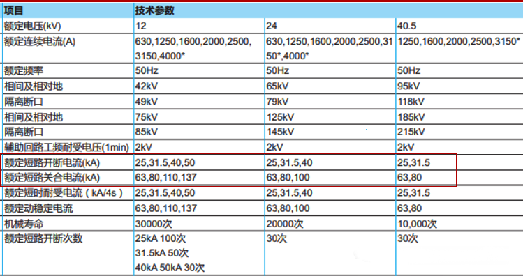 如下圖所示,為某知名品牌的真空斷路器部分技術(shù)參數(shù),圖中紅色框內(nèi)的額定短路關(guān)合電流與額定短路開斷電流之比為2.5,該比值對12kV、24kV、40.5kV均有效。
