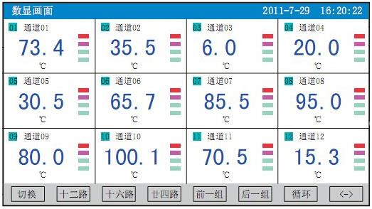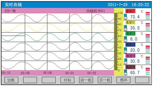 YR-ASR600型無紙記錄儀安裝在值班室內(nèi),無紙記錄儀的實時曲線畫面同時顯示六組數(shù)據(jù)值,數(shù)顯畫面能同時顯示十二組數(shù)據(jù)值,操作人員主要通過這兩種顯示方式監(jiān)測觀察生產(chǎn)線運(yùn)行情況。如窯頭看火工根據(jù)無紙記錄儀顯示的溫度和自己多年積累的觀火經(jīng)驗,及時地調(diào)整窯的運(yùn)轉(zhuǎn)狀態(tài);如水泥窯煙室溫度過高或者過低時無紙記錄儀會發(fā)出測量值報警提示和連鎖閃光報警器報警,操作人員就能及時調(diào)整噴煤機(jī)轉(zhuǎn)速去改變喂煤量的大小,保證生產(chǎn)出質(zhì)量好、產(chǎn)量高、消耗低的熟料。