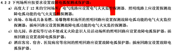 簡(jiǎn)言之,人員密集場(chǎng)所+有可燃物的房間需設(shè)置AFDD,設(shè)置部位為照明和插座回路。