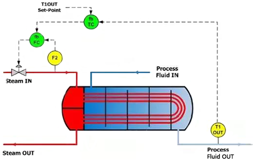 為了便于說(shuō)明,考慮圖中所示的換熱器,殼程流體是需要加熱到某個(gè)溫度設(shè)定點(diǎn)的過(guò)程流體,該結(jié)果溫度是在換熱器T1的出口處測(cè)量的-OUT(受控變量)。